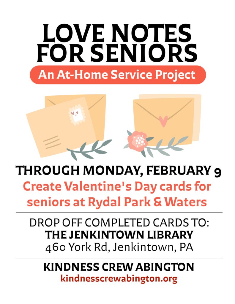 Help us create 140 Valentine’s Day cards for seniors at Rydal Park and Waters. Cards will be shared with Health Center residents and those living on the personal care memory floor.